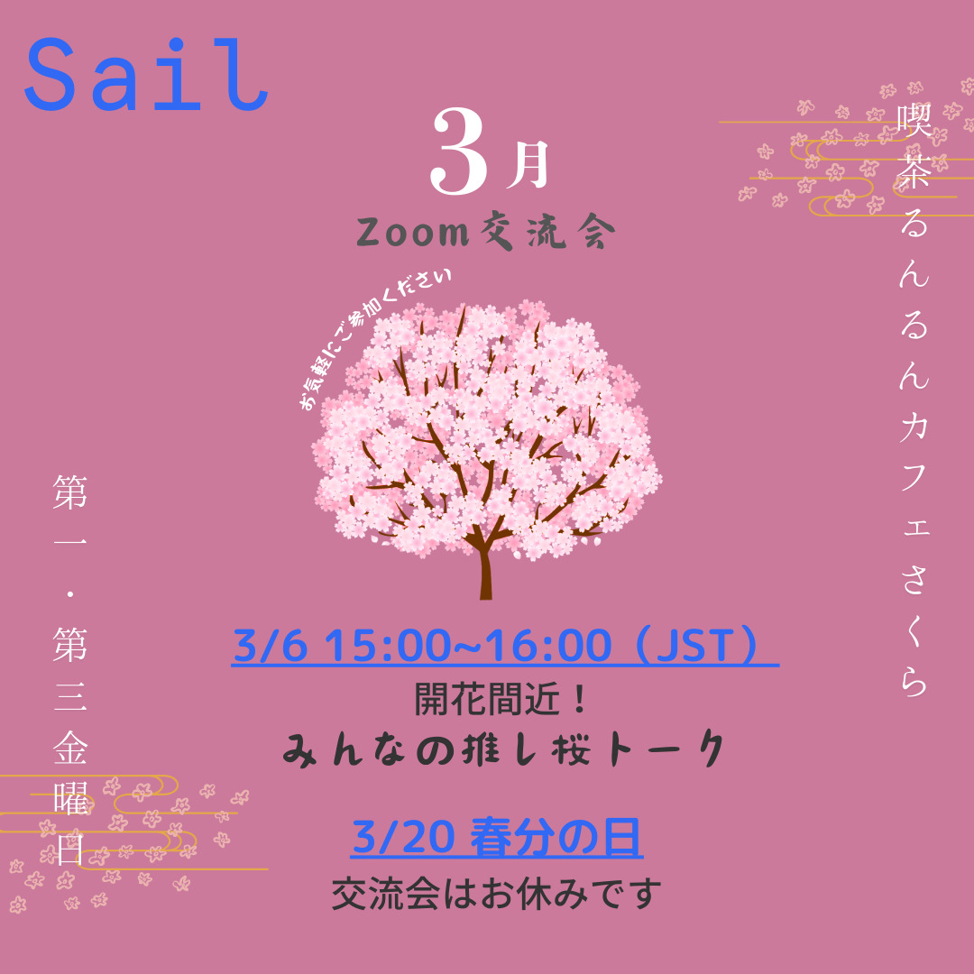 2026年3月のオンライン交流会「喫茶るんるん/カフェさくら」のお知らせです。下のURLをクリックして参加できます。