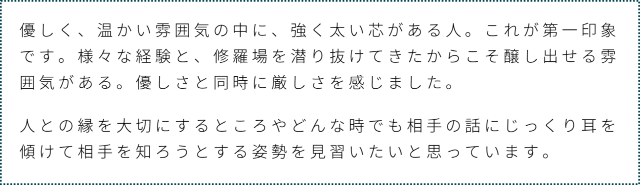 私は事業より人を見る。というのも、事業というものは時代や環境、タイミングもありますし、改善改良ができる。どんどん変わっていくはずですから。