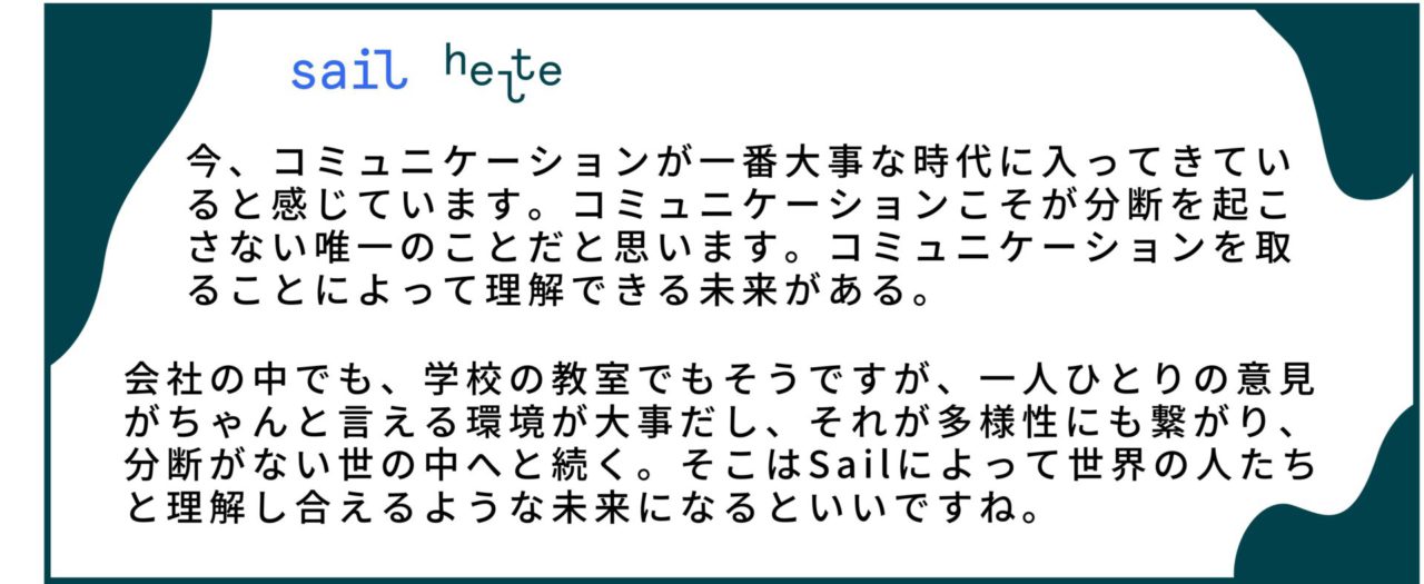 日本人が、Sailを通して世界の人たちと繋がることで、多様な生き方、考え方を認め合うことができるといいですね。そういうことがとても大事な時代だと思います。