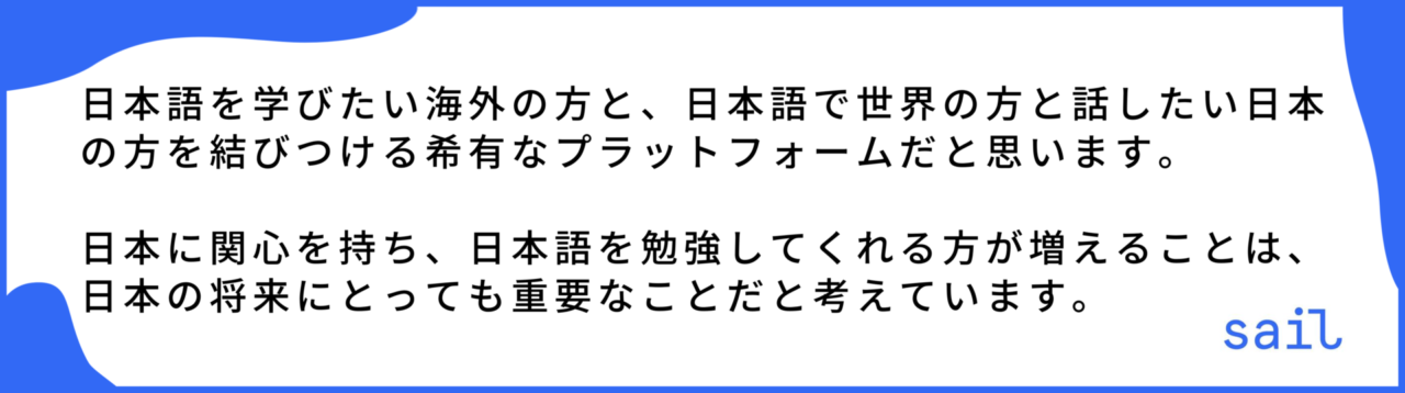 日本語で会話をすることで、日本人も海外の人もお互いに学び合う。これが、FacebookでもTwitter、LINEでもできない、Sailの圧倒的な価値です。